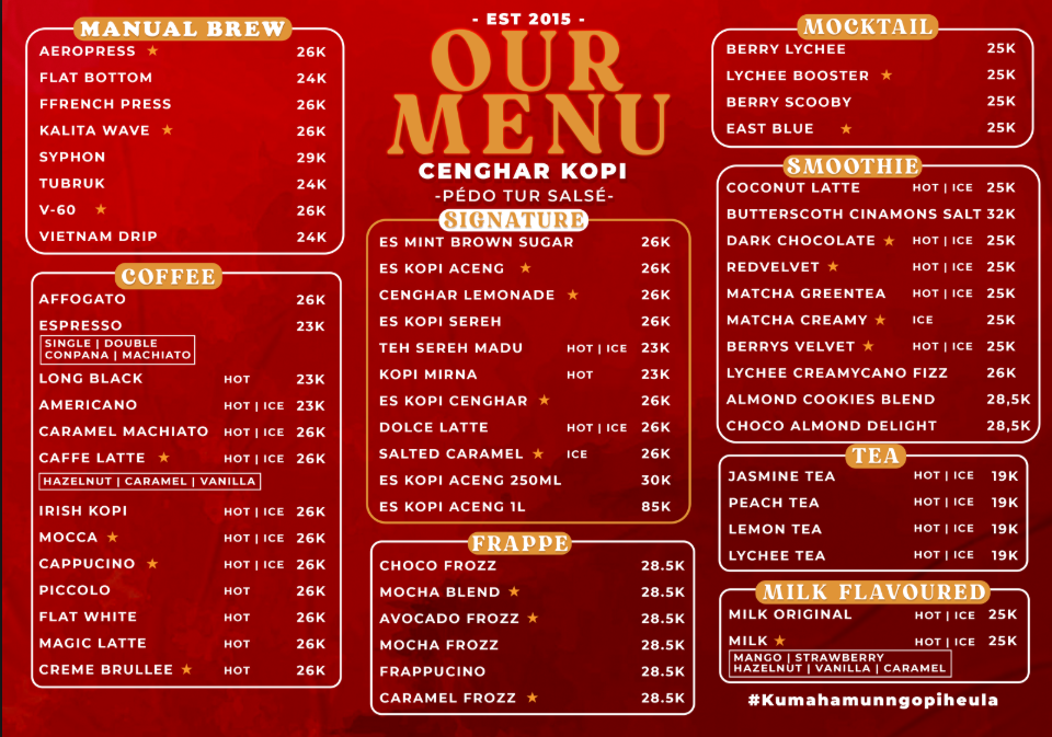 Cenghar Kopi menghadirkan pengalaman menikmati kopi berkualitas dengan berbagai pilihan kopi nusantara. Tempat yang nyaman untuk bersantai sambil menikmati kopi pilihan Anda.